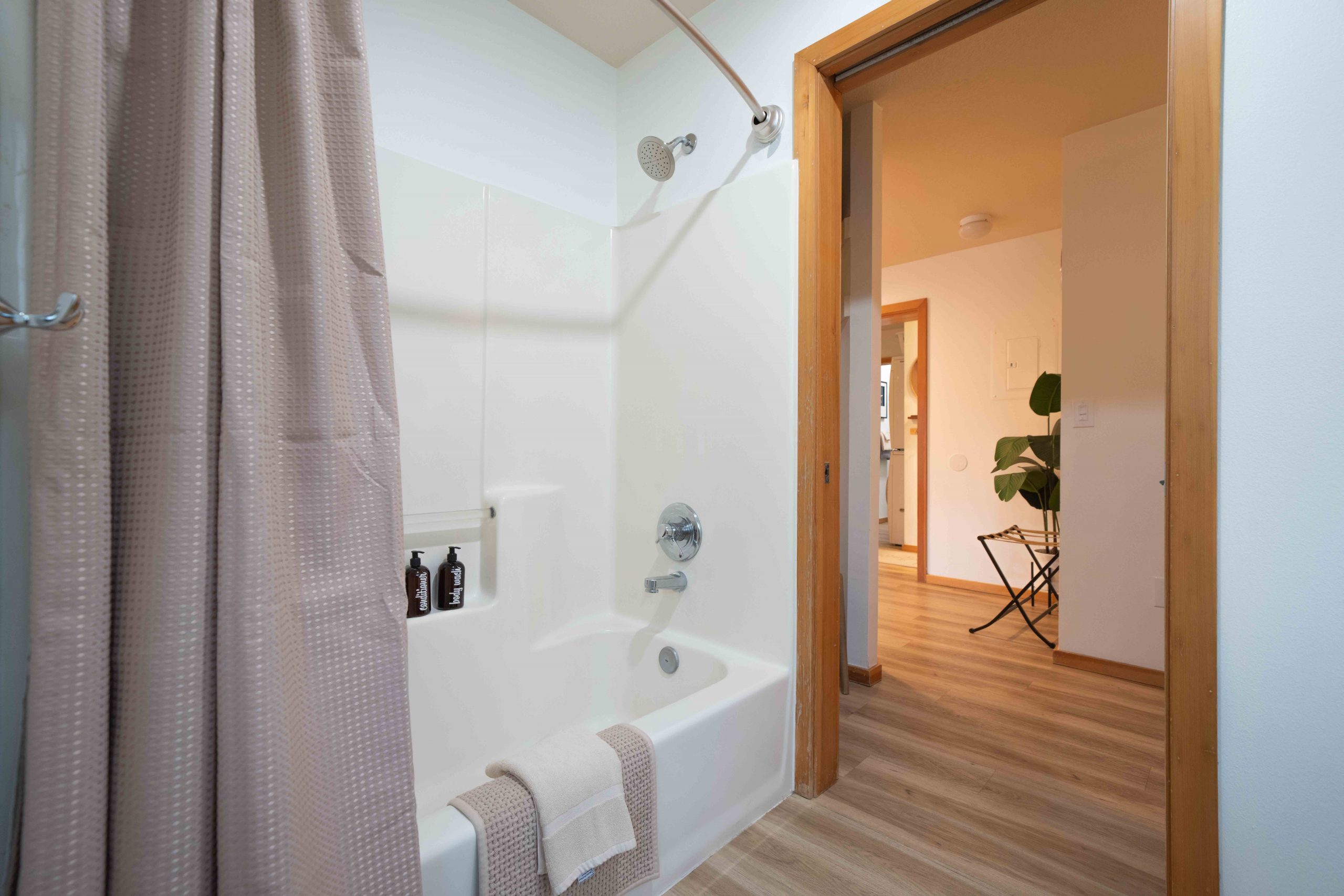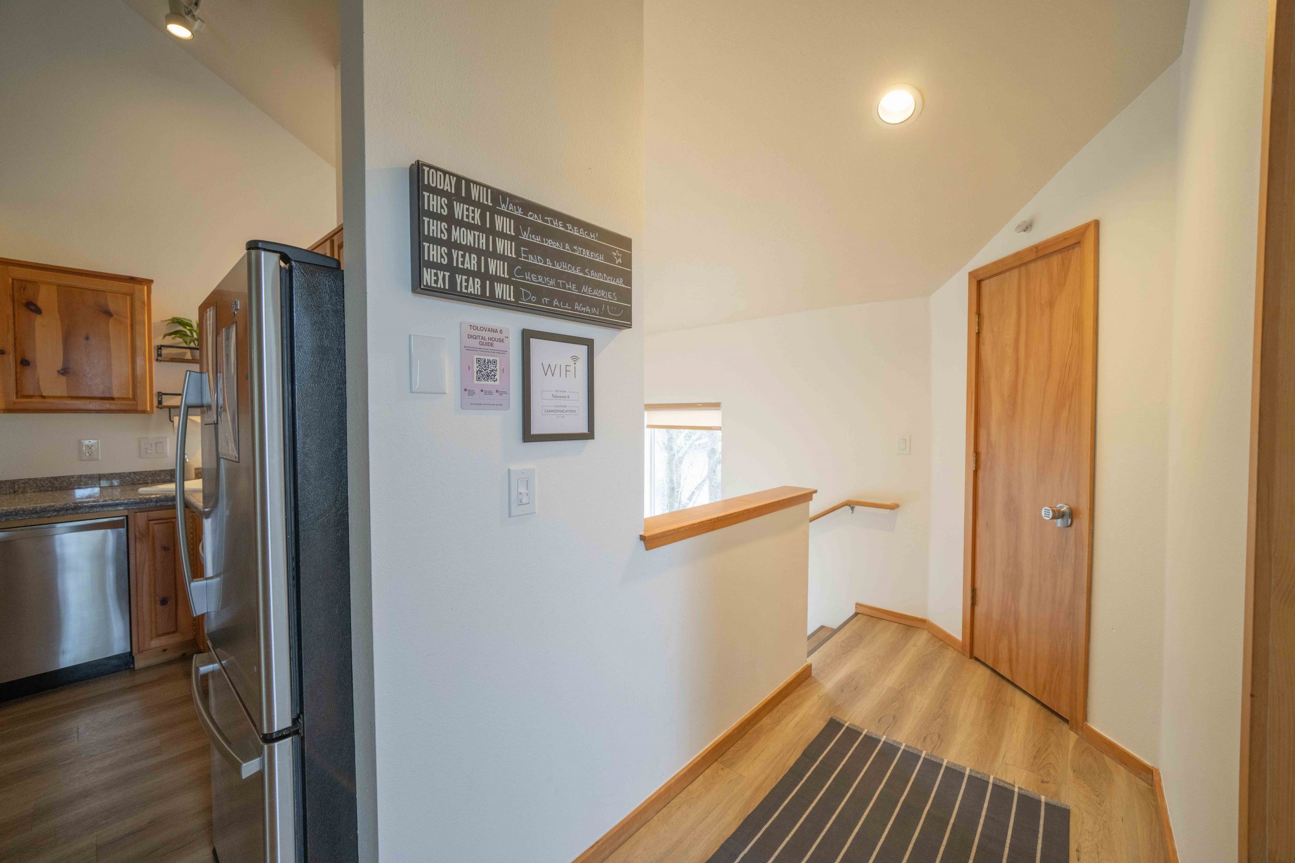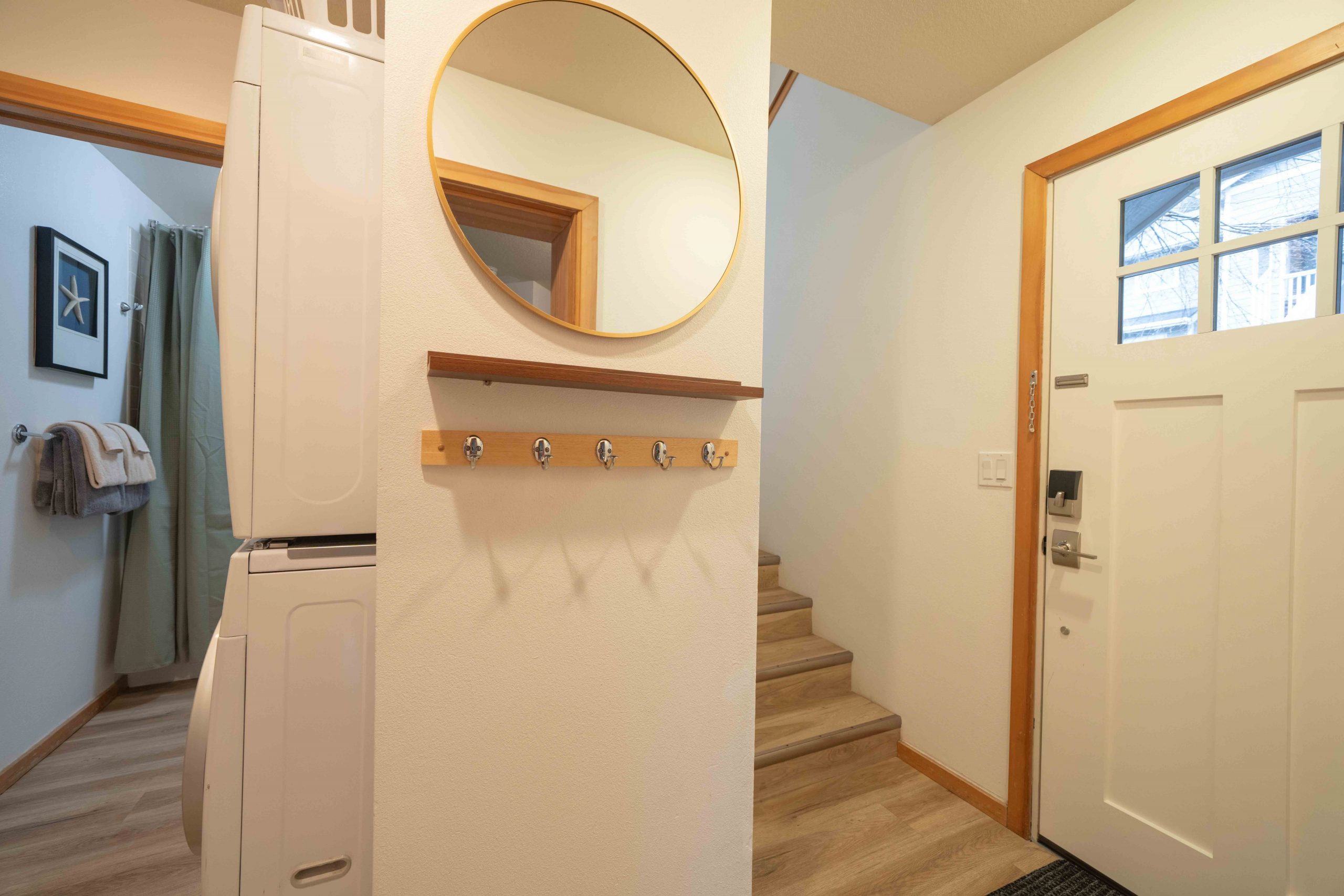Inside, the townhome offers plenty of space to spread out and unwind. The ground-floor entry welcomes you with a convenient spot to hang jackets, umbrellas for drizzly coastal days, and neon safety vests for evening walks with flashlights. The ground floor primary suite is ideal for parents looking for a quiet retreat, featuring a king-size bed, private balcony, Apple TV, and a full bathroom. Down the hall, the second full bathroom includes a large soaking tub—perfect for relaxing after a long day at the beach. Nearby, the family will love the Bunk Room, complete with one full/twin and one twin/twin bunk beds, retro Super Nintendo & Sega gaming systems, board games, and Apple TV with all their favorite streaming apps including Disney+.