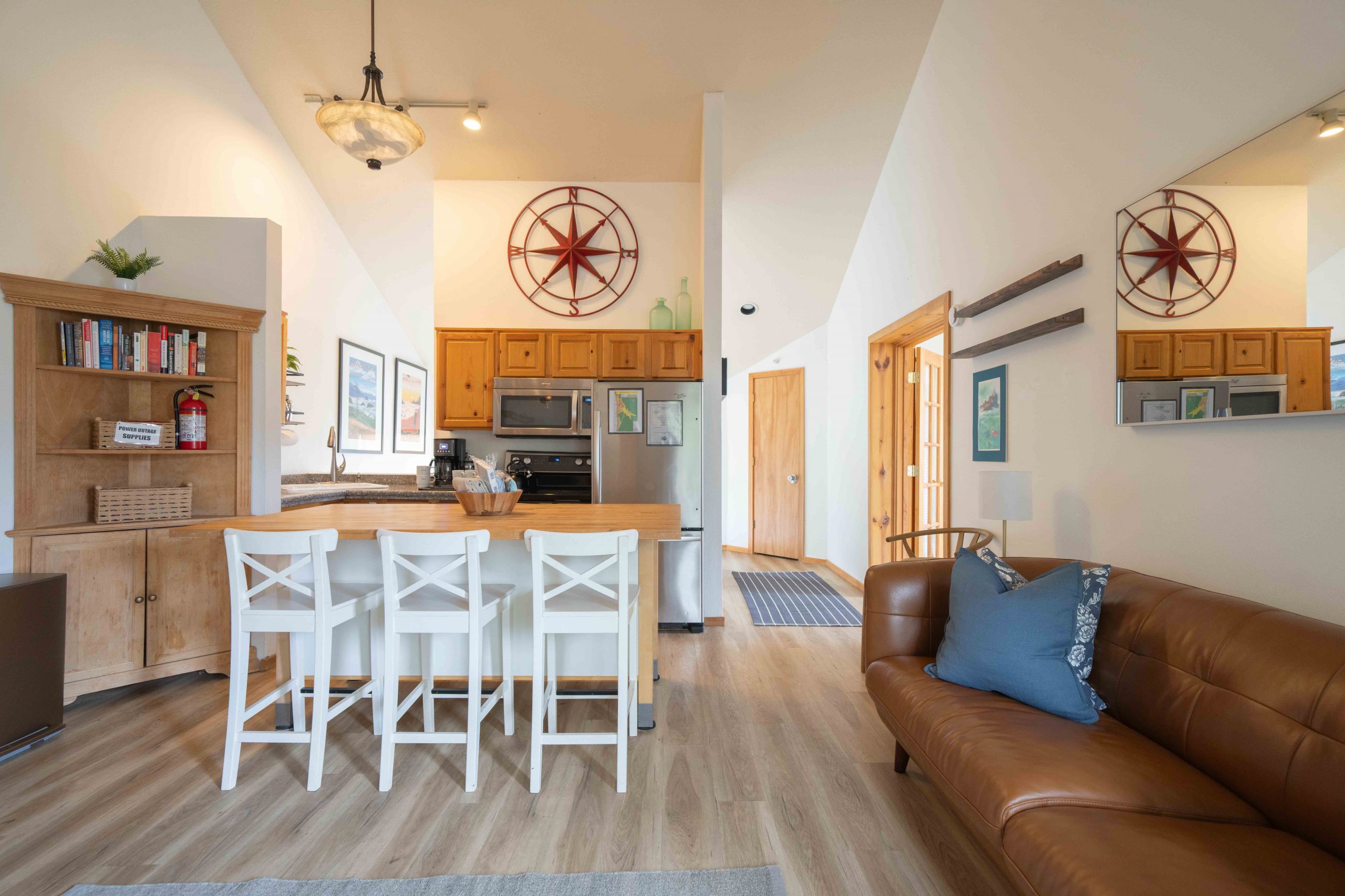 Up the stairs on the second floor, the heart of the home awaits with a cozy open-concept kitchen, extra large island, and living area designed for gathering together. The small but fully equipped kitchen makes family meals easy, and the living room comfortably seats 6 but with room for 8. After a day of beach adventures, cozy up around the gas fireplace for movie night on the 55-inch TV with Smart TV, live cable, Hulu, Disney+, and HBO Max. Step out onto the living room balcony for peaceful bird watching and fresh coastal air.